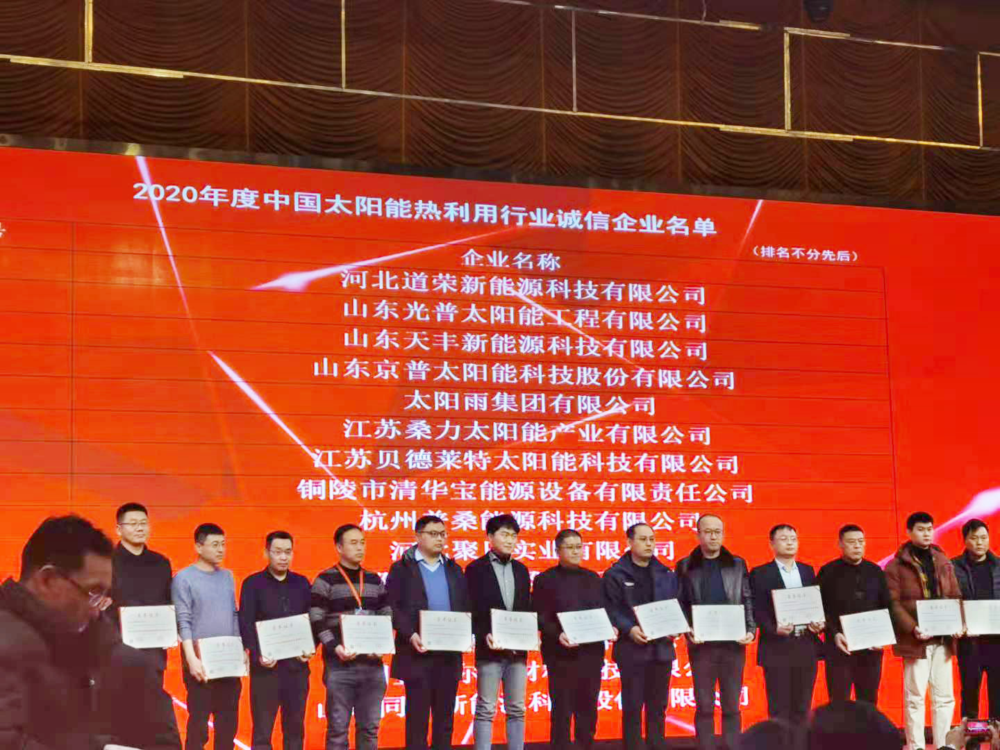 12月8日,2020年中國太陽能熱利用行業(yè)年會在邢臺召開,山東天豐新能源科技有限公司受邀參加本次會議,在會上,天豐新能源再度蟬聯(lián)“中國太陽能熱利用行業(yè)誠信企業(yè)”稱號,并獲頒榮譽(yù)證書。