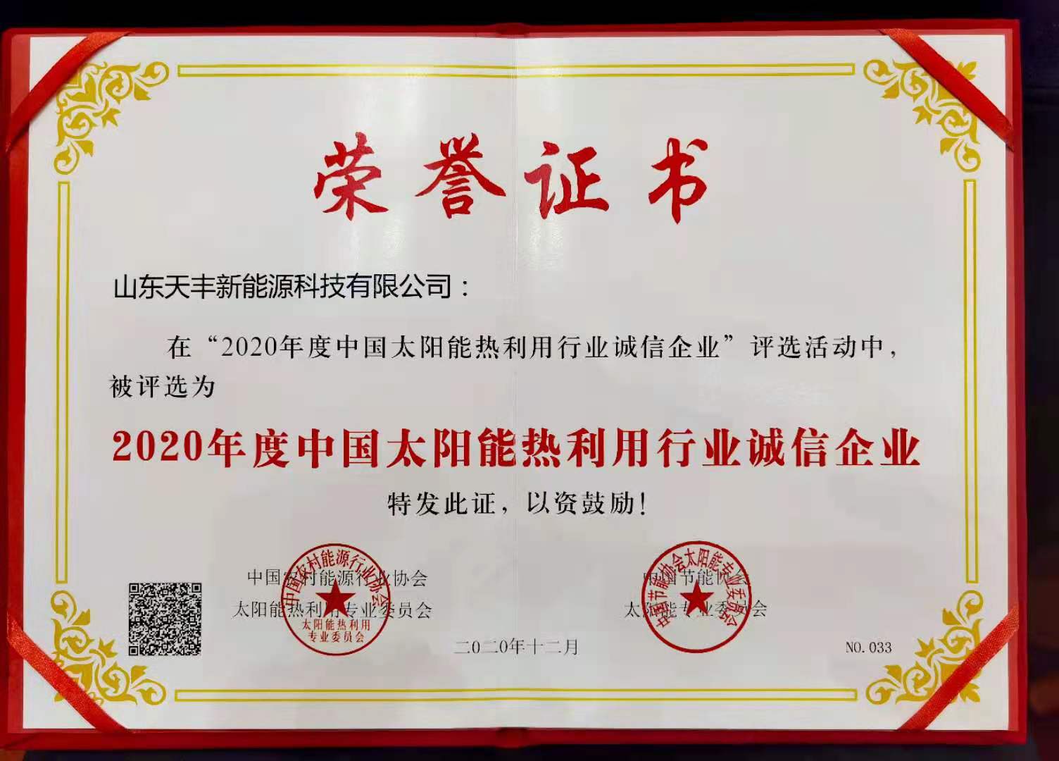正是憑借良好的企業(yè)信用,創(chuàng)建優(yōu)良精品工程的企業(yè)形象,天豐在市場不斷積攢良好的口碑。“中國太陽能熱利用行業(yè)誠信企業(yè)”榮譽(yù)證書的獲得,是行業(yè)對天豐始終堅持誠信經(jīng)營的肯定。天豐將繼續(xù)以此為契機(jī),通過加強(qiáng)信用、合同等管理,在互信互助、坦誠合作的基礎(chǔ)上不斷開拓進(jìn)取,以質(zhì)量促誠信,以誠信鑄未來!